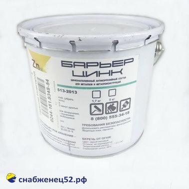 Барьер-цинк (ТУ2312-001-16406613-2013) - однокомпонентная цинконаполненная композиция на полимерной основе, содержащая 96% цинка, для защиты от коррозии черных металлов.