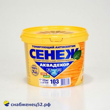 Антисептик СЕНЕЖ АКВАДЕКОР предназначен для долговременной защиты древесины от атмосферных осадков, плесневых, деревоокрашивающих и дереворазрушающих грибов, водорослей и насекомых-древоточцев, а также декоративной отделки под ценные породы. Сочетание в СЕНЕЖ АКВАДЕКОР алкидов, акрилатов и льняного масла улучшает проникновение в древесину, формирует эластичное дышащее защитное покрытие с мягким шелковистым блеском.