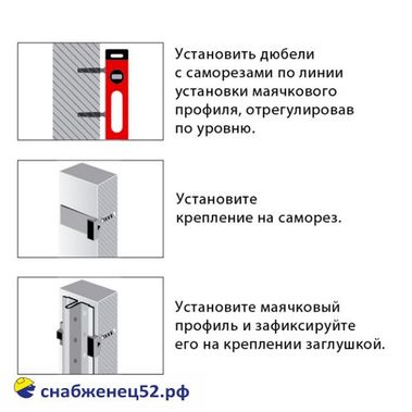 Для установки крепления для маяков в стене необходимо проделать отверстия, в которые вставляются дюбели и вкручиваются саморезы. На шляпку самореза одевается крепление и надежно фиксируется заглушкой, входящей в комплект каждого крепления.