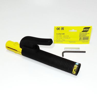 Электрододержатель ESAB CONFORT 400 открытого типа (классическая система «крокодил») с изолированным корпусом (рукояткой) и наконечником разработан шведской компанией ESAB для сварочных работ всех типов номинальным током 200 А. Предназначен для крепления электрода и подачи на него электрического заряда для возбуждения сварочной дуги.